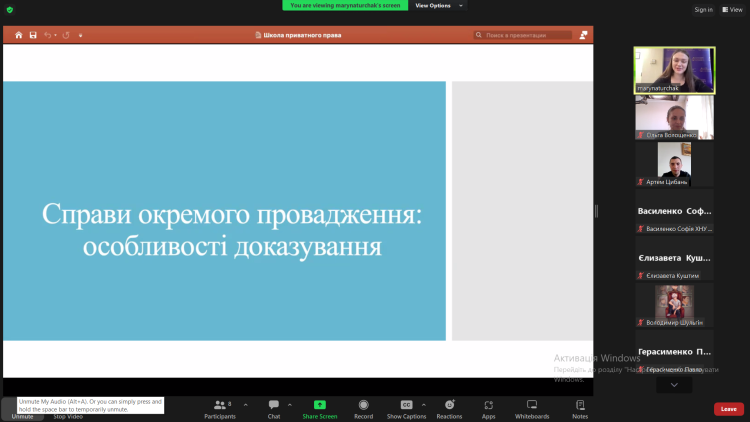 ![]() 04 квітня 2024 року на базі слухацької аудиторії науково-практичного гуртка «Школа приватного права», який діє при кафедрі цивільно-правових дисциплін юридичного факультету Харківського національного університету імені В.Н. Каразіна відбулось проведення майстер-класу на тему: "Справи окремого провадження: особливості доказування". Спікер заходу, адвокатеса цивільної практики Юридичної компанії «Прасолов та Партнери» доповіла інформацію стосовно категорії справ які підлягають розгляду в порядку окремого провадження. Особливу увагу було приділено тонкощам доказування юридичних фактів в рамках окремого провадження з посиланням на актуальну судову практику сьогодення. Доповідь супроводжувалась прикладами із власної практики пані Марини та жвавим спілкуванням з аудиторією. |